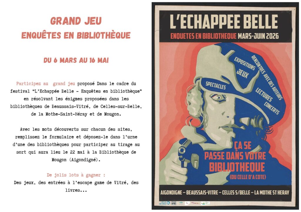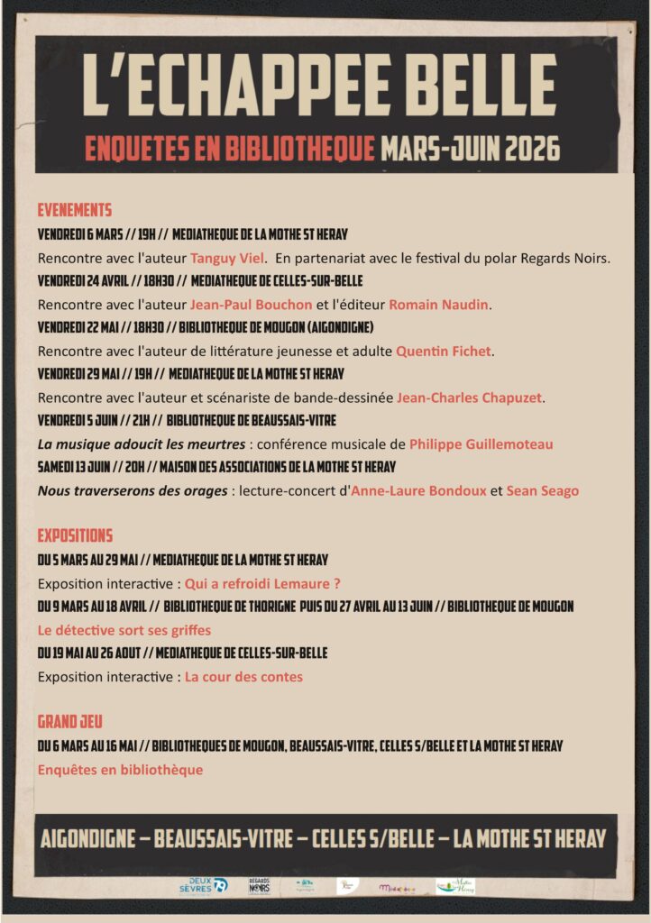 De Mars à Juin 2026, Beaussais-Vitré, La Mothe, Celles-sur-Belle et Aigondigné s’unissent pour proposer au public une animation originale dédiée au genre policier : L’Échappée Belle. Du polar en pagaille, pour petits et grands, amateurs d’enquêtes ou simples curieux, cet événement met à l’honneur l’univers mystérieux et captivant du roman noir.